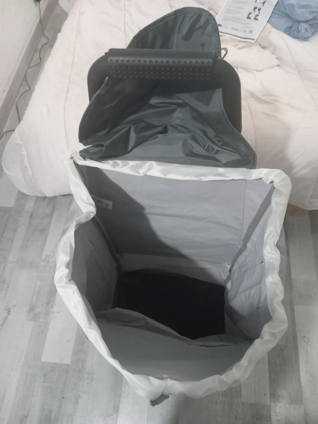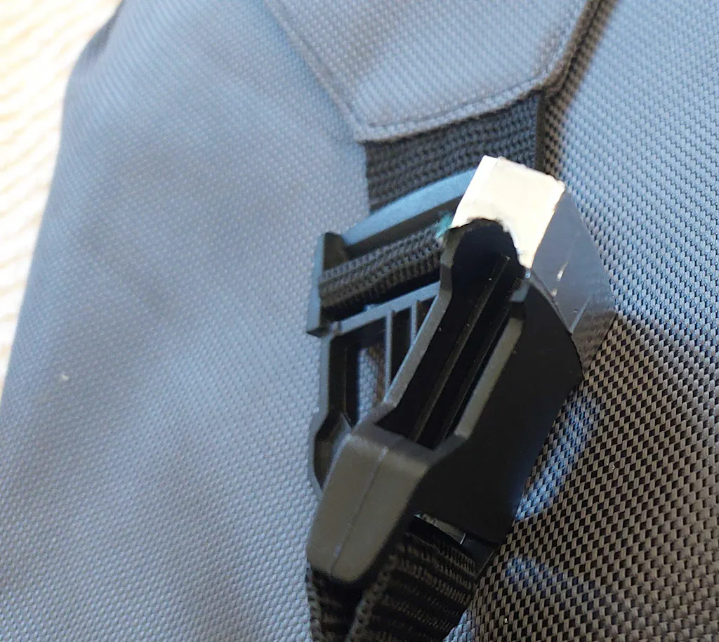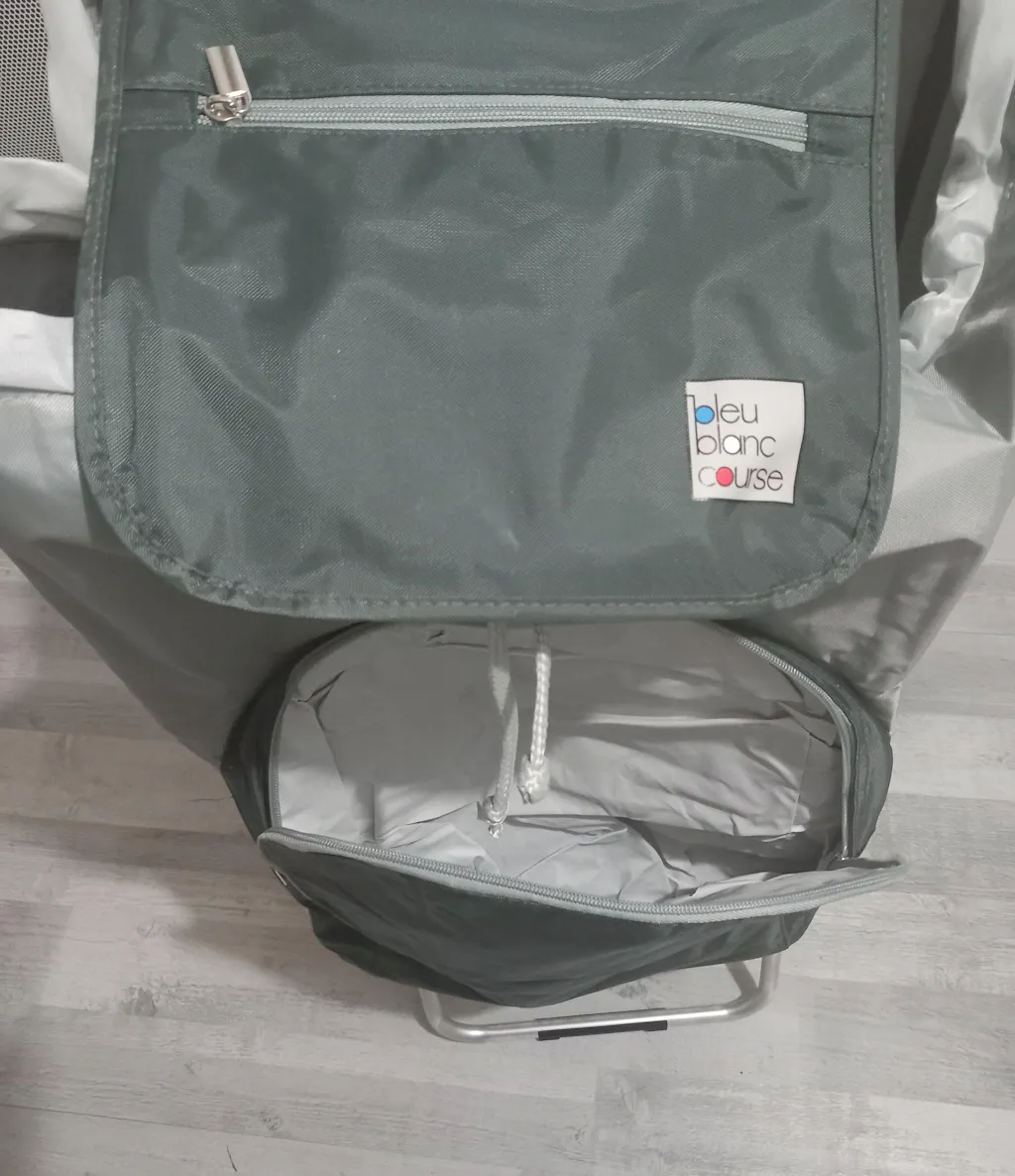 très bon produit sauf que la fixation du sac à l'arrière en plastique a cassé, je n'ai plus que le scratch du haut pour le maintenir sur le chariot